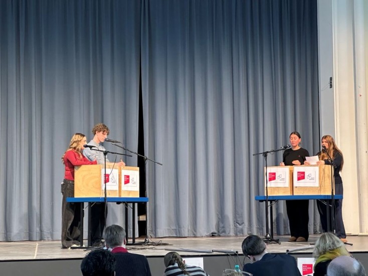Soll es für das Fahren von E-Scootern eine Führerscheinpflicht gelten? Das war die Frage, die in der Hinrunde von 8 Debattant*innen der 9.Klassen und von ebenso vielen Debattant*innen der Oberstufe diskutiert wurde. Nach einer Hin- und Rückrunde standen sich dann im Finale der 9.Klasse Amir, Willy, Selimhan und Augustine mit der Frage Sollen schriftliche Prüfungen für den Schulabschluss am Computer geschrieben werden? gegenüber. In der Oberstufe debattierten auf beeindruckende Art und Weise Friederike, Luise, Ansgar und Mia-Sophie über das Thema Soll es eine allgemeine Dienstpflicht für Jugendliche geben? Nach einem aufregenden und langen Wettbewerbstag mit 16 Debattierenden und mehr als 20 Juror*innen standen am Schluss Amir und Willy als die Sieger der 9.Klasse und Friederike und Mia-Sophie als Siegerinnen der Oberstufe des Schulwettbewerbs fest und werden das MCG beim Regionalwettbewerb gegen andere Schulen am 17.2. vertreten. Eine tolle Leistung von allen Debattant*innen und Juror*innen!