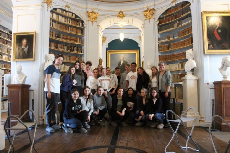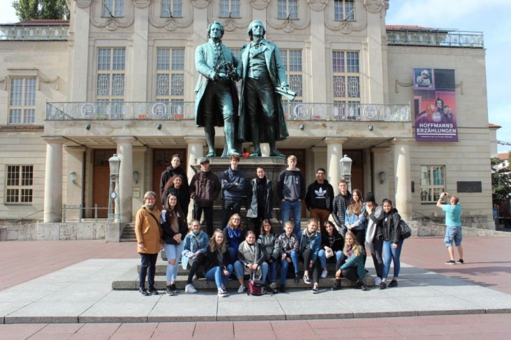Am Mittwoch mussten wir Leipzig nach viel zu kurzer Zeit leider wieder verlassen, um uns auf den Weg nach Weimar zu machen, wo wir den Spuren Goethes und Schiller nachgingen. Es folgte ein ereignisreicher Tag im Goethe-Wohnhaus und der sehr beeindruckenden Anna-Amalia-Bibliothek. Zuerst erkundeten wir Goethes damaligen Wohnsitz und bekamen Eindrücke über seine, im Gegensatz zu anderen Schriftstellern, guten Lebensverhältnisse. Dies lag an seiner engen Freundschaft zu Herzog Karl August, durch den er vieles finanziert und ermöglicht bekam. Anschließend wurden wir in der Anna-Amalia-Bibliothek herumgeführt, welche, wie schon erwähnt, durch seinen Rokokosaal ein sehr sehenswerter Ort war.