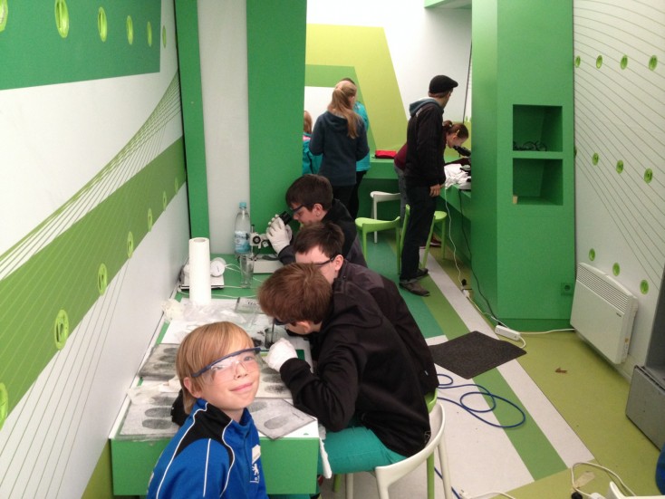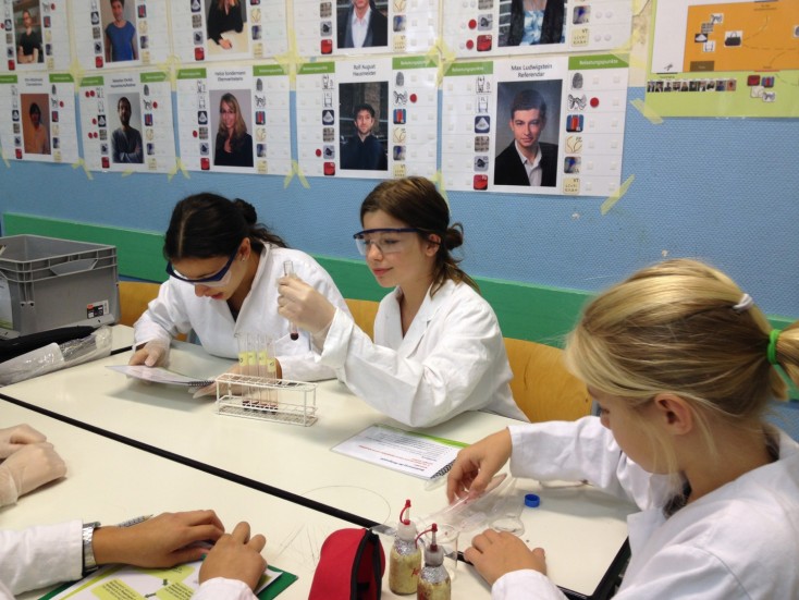 Einen Tag lang durfte jede siebte Klasse mit allen möglichen naturwissenschaftlichen Untersuchungsmethoden einen Kriminalfall lösen. Dazu stand neben einem Klassenraum das große, vor der Schule geparkte Humboldt-Bayer-Mobil zur Verfügung. Der große Truck war gespickt mit Fundstücken des "Tatortes", Mikroskopen und Gerätschaften zur Untersuchung der Materialien. Von den SiebtklässerInnen wurden Indizien gesammelt, Möglichkeiten diskutiert und der Tathergang rekonstruiert.