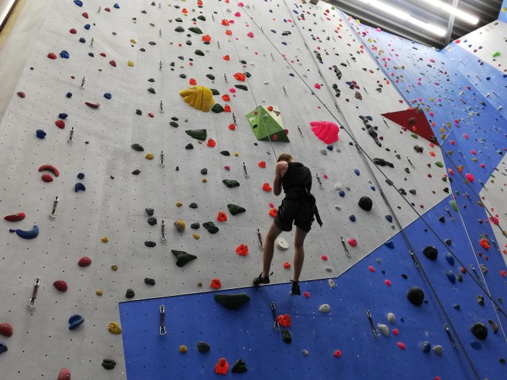 Dieses Mal ist der Grundkurs Fitness zur nagelneuen Kletter. -, Beachvolley. - und Soccerhalle "South Rock" nach Marienfelde aufgebrochen. In der niedrigeren oberen Halle gab es erst einmal Materialkunde und die wichtigsten Regeln zum gegenseitigen Sichern. Nachdem ein paar Proberouten erklommen waren, durften wir endlich in die große Kletterhalle, in der noch fleißig verschraubt wurde.