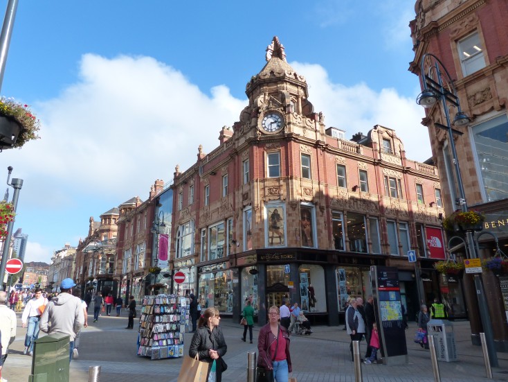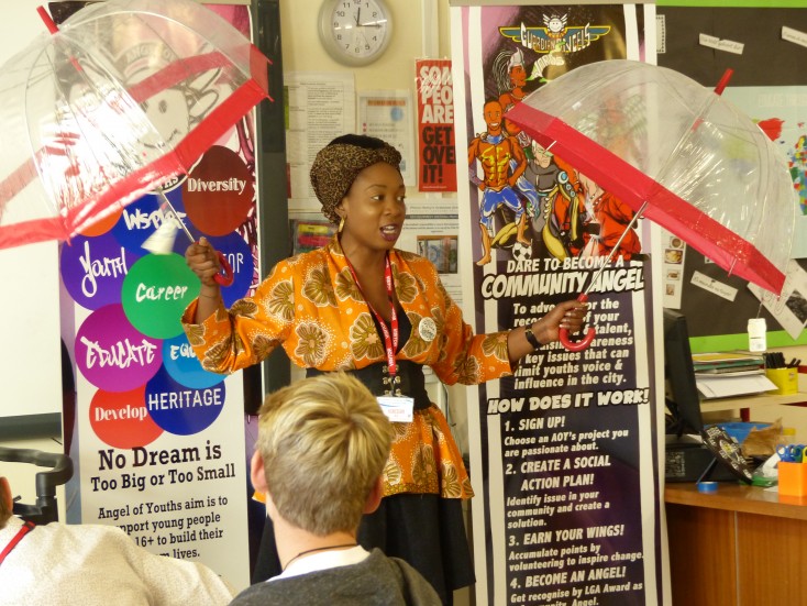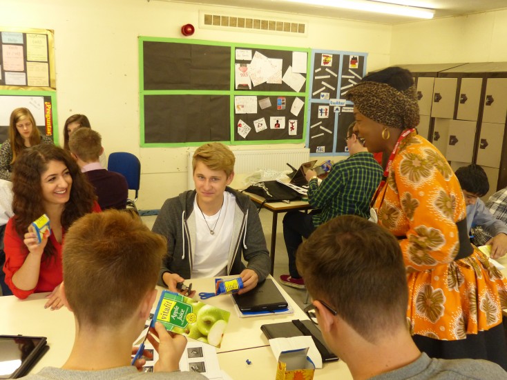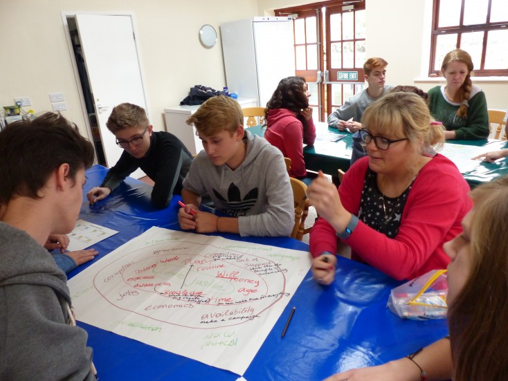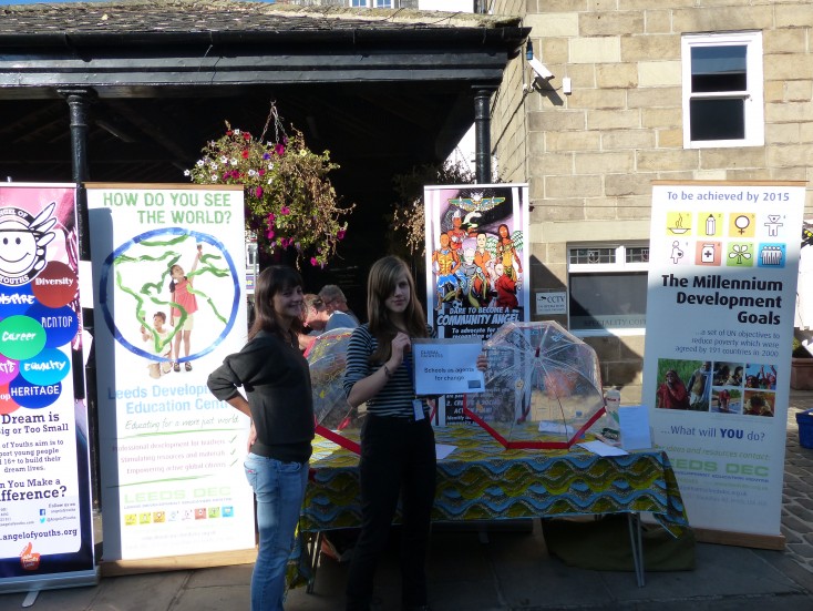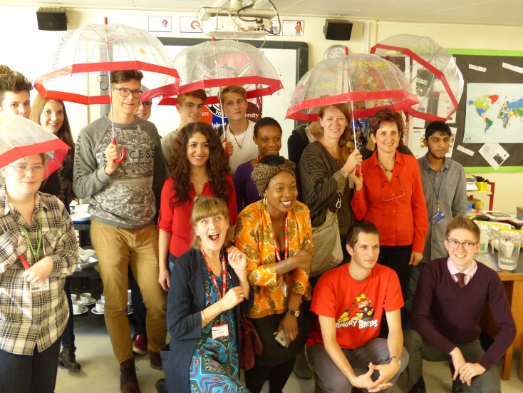 Am zweiten Tag waren wir Gäste in der Prince Henry’s Grammar School, wo uns die Schulleitung, Janet Sheriff, und Greg Mulholland (local MP) begrüßten. An diesem Tag bereiteten wir u. a. einen Fragenkatalog für unsere Straßenaktion vor und bemalten Regenschirme mit unseren Zukunftswünschen, die bei unserer Befragung auf dem Marktplatz von Otley unser Erkennungszeichen werden sollten. Ein Exemplar wanderte später mit nach Berlin. In international gemischten Gruppen sprachen wir Marktbesucher_innen zum Tagungsthema und zu regionalen Problemen und deren Lösungen an. Es wurden zum Teil sehr lange Interviews, aber unsere Fragen wurden mit regem Interesse beantwortet.