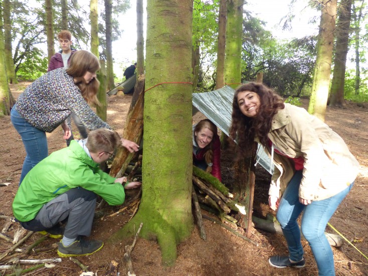 Bei einer Outdooraktivität am Nachmittag übten wir in einer Art Survival-Training in einem nahegelegenen Waldstück Zelte zu bauen, winddicht zu gestalten, Feuerstellen zu errichten und diese auch zu nutzen. Alles immer wieder in international zusammengesetzten Teams bestehend aus Jugendlichen und Lehrkräften.