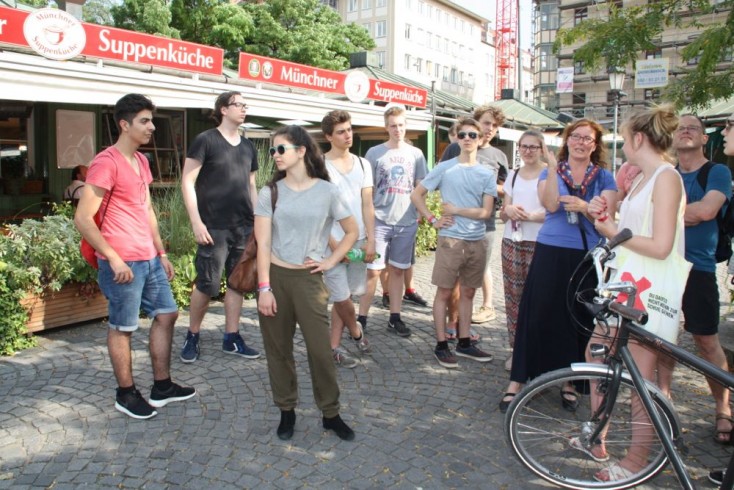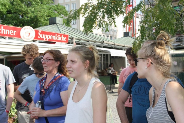 Gestartet wurde am Bahnhof Südkreuz. Von dort aus fuhren wir mit dem ICE nach München HBF. Im Zug wurde hauptsächlich geschlafen und Karten gespielt. Nach Ankunft ging es direkt zum Hotel, wo nach kurzen Einweisungen die Zimmer bezogen werden konnten. Nach kurzer Freizeit, die viele fürs Auspacken und einen kleinen Hotelrundgang nutzten, hatten wir Gelegenheit bei einer Stadtführung erste Eindrücke zu sammeln. Dabei spielte das Wetter mit ca. 30 Grad Celsius und hoher Luftfeuchtigkeit mit.