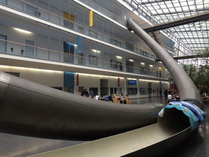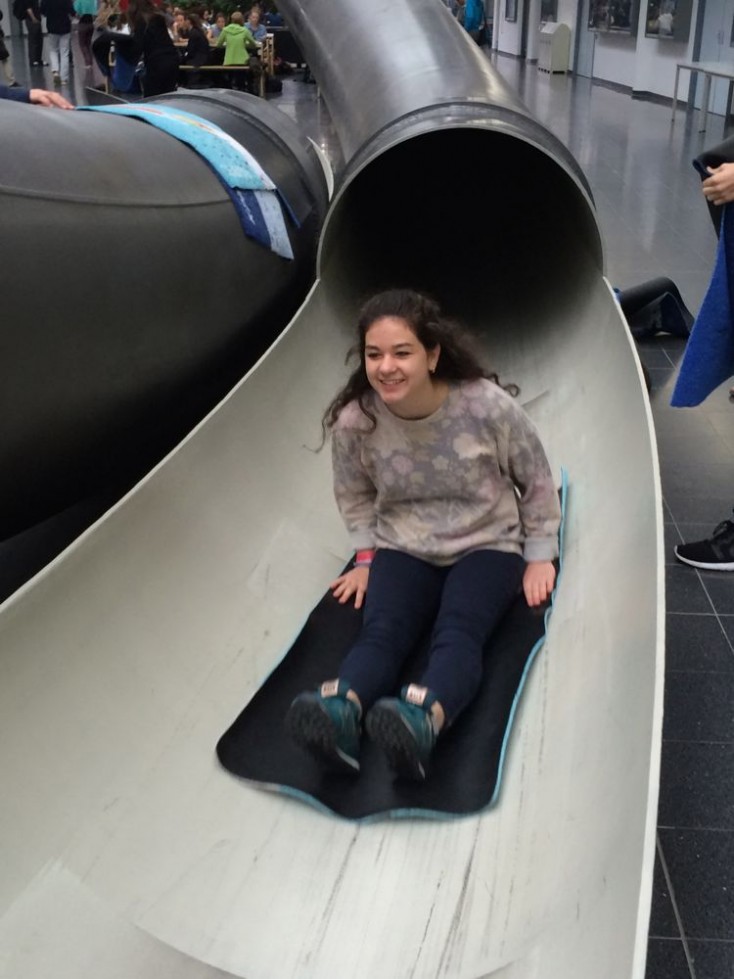 Der Forschungsreaktor Garching dient vor allem zur Forschung mit Neutronen. Das angereicherte Uran wird hier nicht zur Energie- sondern zur Erkenntnisgewinnung genutzt. Deshalb konnten wir viele interessante Experimentierstellen und Messinstrumente, die eigens für diesen Zweck angefertigt worden waren, besichtigen. Es war total interessant zu sehen, was man alles mit so winzigen Teilchen wie Neutronen anstellen kann. Faszinierend ist auch, dass die Neutronenforschung in vielen unterschiedlichen Bereichen, also nicht nur in der Physik, ihre Anwendung findet, wie zum Beispiel in der Strahlentherapie gegen Hautkrebs. Nach der Führung durch den Reaktor gingen wir zur Mathematik-Fakultät der Uni, um dort in der Cafeteria etwas zu essen. Das witzige an dieser Cafeteria ist, dass sich in ihrer Mitte zwei Rutschen befinden, die eine Parabel bilden. Man kann sich also einfach eine Rutschmatte holen, in den vierten Stock fahren und von dort aus ins Erdgeschoss rutschen. Es ist erstaunlich, wie sehr man in solch einer Parabel beschleunigt wird. Nach dem Essen besuchten wir dann eine Mathe-Ausstellung namens x-Quadrat. Dabei wurden wir in Gruppen von Studenten über mathematische Phänomene aufgeklärt. Einige Schüler dürften dabei einen sogenannten „Erleuchtungsmoment“ erlebt haben.