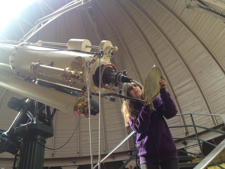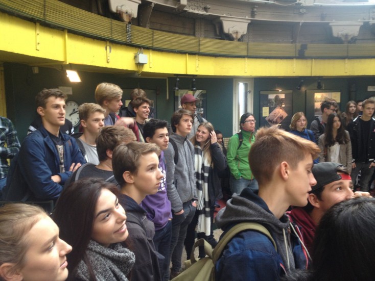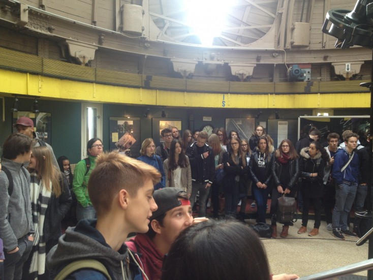 Nach dem Vortrag gingen alle gemeinsam zur Sternwarte auf den Insulaner, um das riesige Fernrohr, den Bamberg-Refraktor, zu bewundern. Er wurde 1889 von der Firma Carl Bamberg in Berlin-Friedenau gebaut und ist bis heute gebrauchsfähig. Wenn sich die Motoren in Bewegung setzen und die große Kuppel geöffnet wird, ist das ein beeindruckender Moment. Es knirscht und knarrt und fast erwartet man, dass sich das tonnenschwere Fernrohr ebenso verhält. Das 4,5 Tonnen schwere Gerät ist jedoch so gut gelagert, dass es sich leicht und ohne ein Geräusch bewegen lässt.