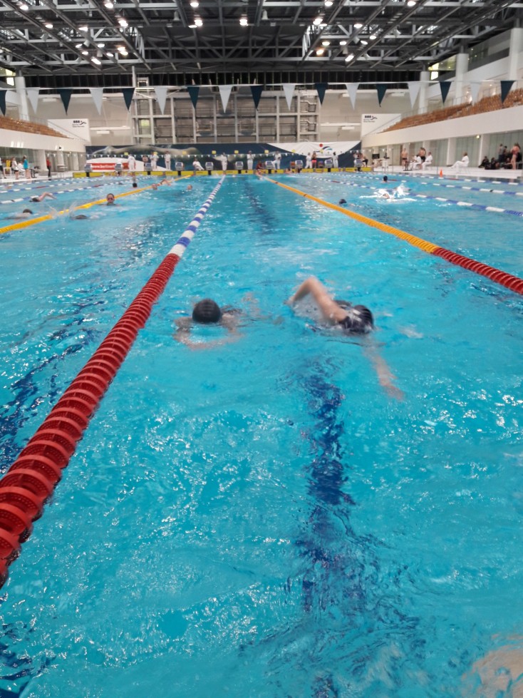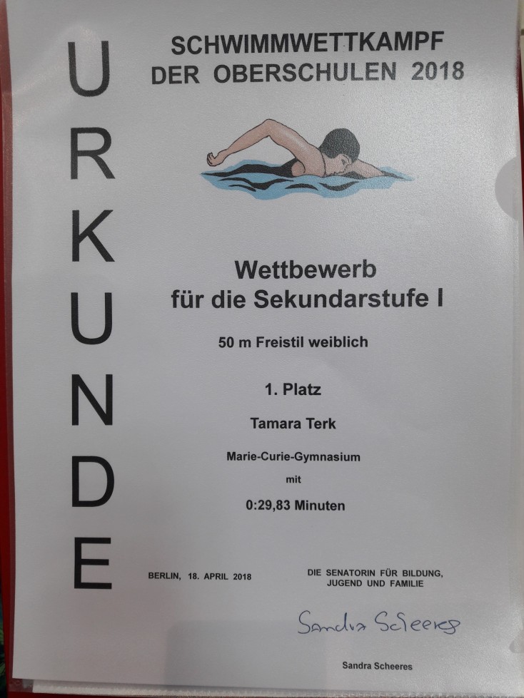 Am Mittwoch, den 18.04.2018 fand der Schwimmwettkampf der Oberschulen der Sekundarstufe 1 statt und auch diesmal war unsere Schule wieder am Start. In der großen Schwimmhalle der Landsberger Allee (Europapark) traten wir mit vier Mädchen und drei Jungs gegen die Konkurrenz an.