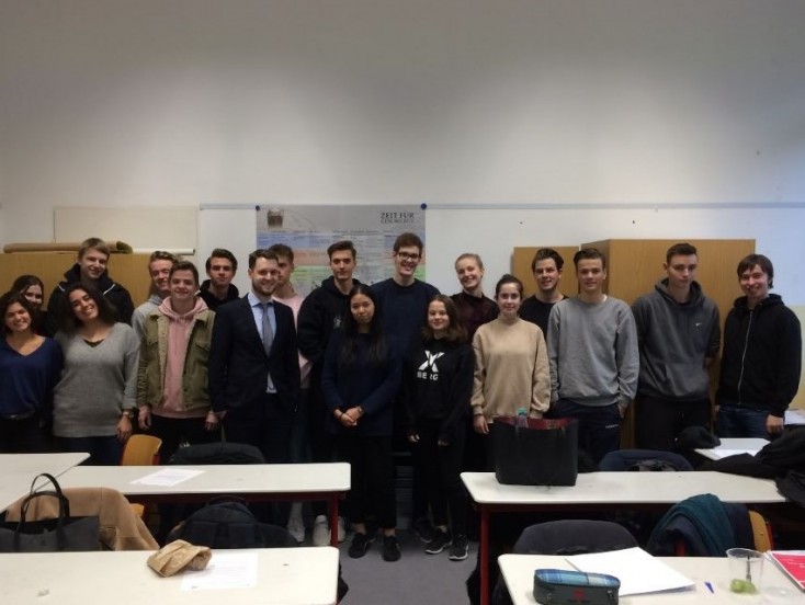 Am 27. November 2018 besuchte Michael Hachula, Referent im BMF-Referat „Finanzpolitische Koordinierung der Eurozone und der EU, Defizitverfahren und Länderanalysen der Eurozone“, im Rahmen von #BMFOnTour das Marie-Curie-Gymnasium, an dem er 2006 selbst Abitur gemacht hat. Mit Schülerinnen und Schülern aus je einem Grund- und Leistungskurs Politikwissenschaft diskutierte er – 10 Jahre nach der Insolvenz der Lehman Brothers-Bank – über die globale Wirtschafts- und Finanzkrise sowie die anschließende Staatsschuldenkrise im Euroraum und welche Erfahrungen daraus gezogen wurden, um die Wirtschafts- und Währungsunion noch stabiler zu machen. Es wurde diskutiert, welche Bedeutung eine stabile wirtschaftliche Entwicklung spielt und welche Fragen zur Zukunft der EU im Fokus der Jugendlichen stehen.