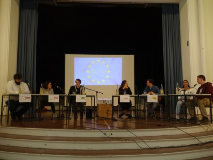 Nach einer kurzen Vorstellungsrunde ging es schon in medias res, denn wir hatten eine ambitionierte Menge von vier Themenschwerpunkten gesetzt. Demnach sollte nicht nur über die Ziele für europäische Klima- und Sozialpolitik sowie die Bedrohung durch den Rechtsextremismus, sondern auch über die zu der Zeit höchst aktuelle Urheberrechtsreform diskutiert werden. Da glücklicherweise alle Politiker recht jung waren, verstanden sie alle die Problematik und positionierten sich einstimmig, ja sogar die CDU-Politikerin, klar gegen diese Reform. Auch wenn bei einer Alternativlösung noch Uneinigkeit bestand, war dies wohl der harmonischste Teil der Diskussion. Bei den anderen Themen wie der Klimapolitik ging es weitaus heißer her, so bildeten sich oft verhärtete Fronten zwischen den Grünen, Linken und SPD einerseits und der CDU und FDP andererseits. Zum Ende blieb noch etwas Zeit für Fragen aus dem Publikum, wobei auch die obligatorische Cannabis-Frage fiel.