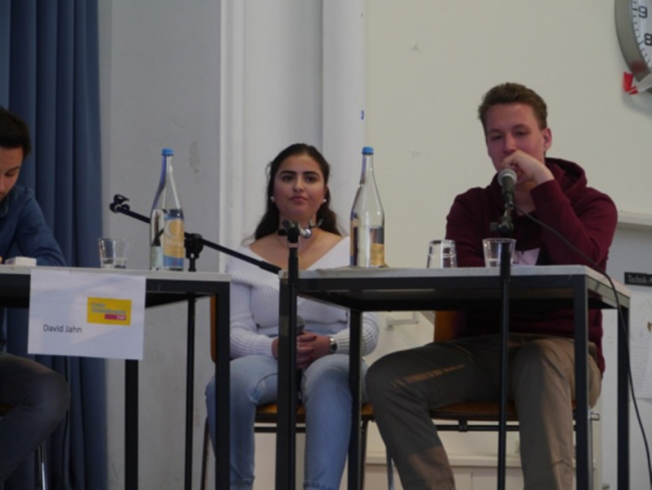 So saßen am Montagvormittag neben unseren beiden wunderbaren Moderatoren Tom Bäßler und Ala Ismail (Q3) die stellv. Juso-Vorsitzende und Listen-Fünfte der SPD, Delara Burkhardt, die Politologin und Landeslistendritte der CDU, Susanne Zels, der Fotojournalist und Listen-Achte der Grünen, Erik Marquardt, der spontan eingesprungene Vorsitzende der Jungen Liberalen, David Jahn, sowie Moritz Fröhlich, Bezirksvorsitzender der Linken in Charlottenburg-Wilmsersdorf auf der Bühne.